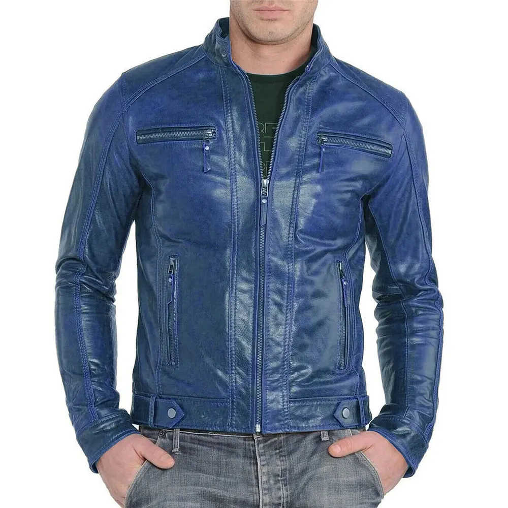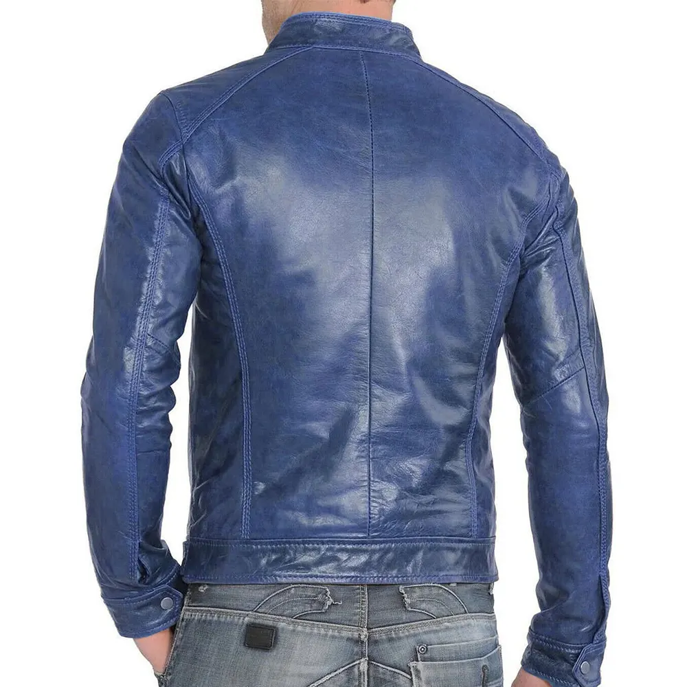 Men’s Slim Fit Blue Cafe Racer Faux Leather Jacket