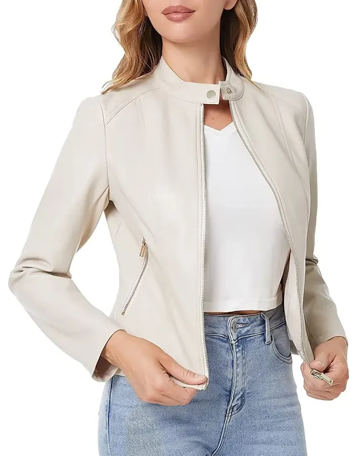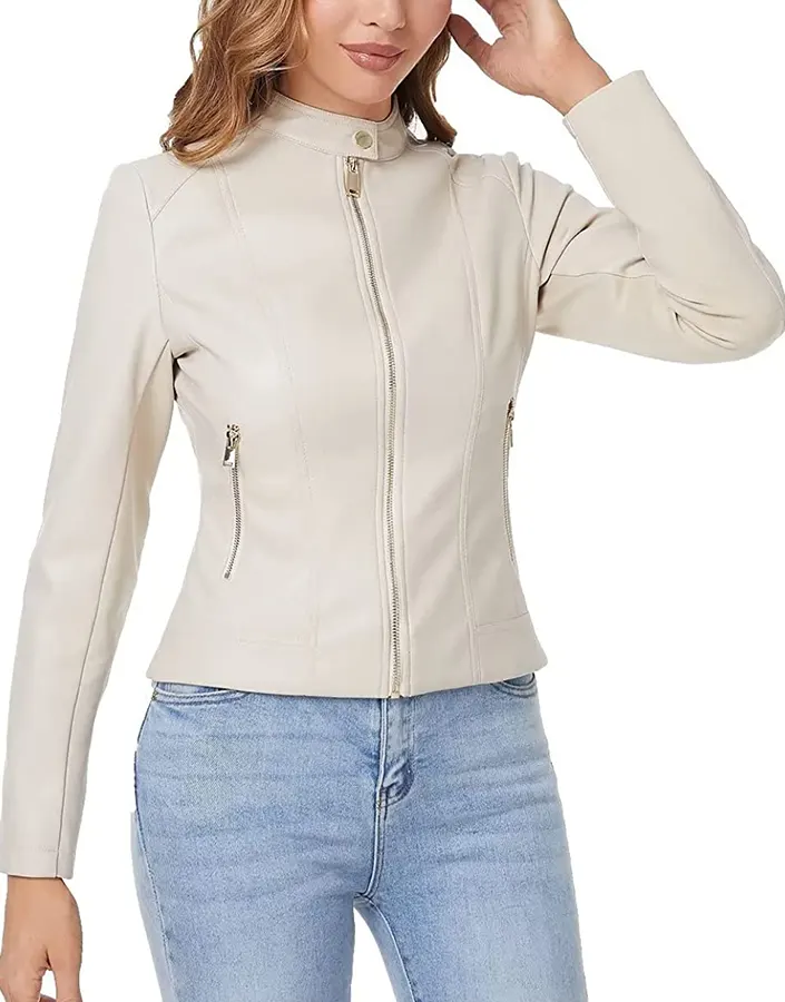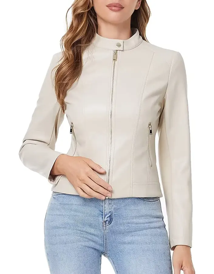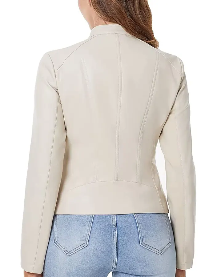 The beige faux leather jacket womens is an effortless yet stunning addition to your wardrobe, boasting a soft beige faux leather exterior with a slim fit for contemporary sophistication and elegant understated luxury. Crafted to exacting standards for superiority and designed to make an impression wherever worn! Perfectly complements any ensemble.