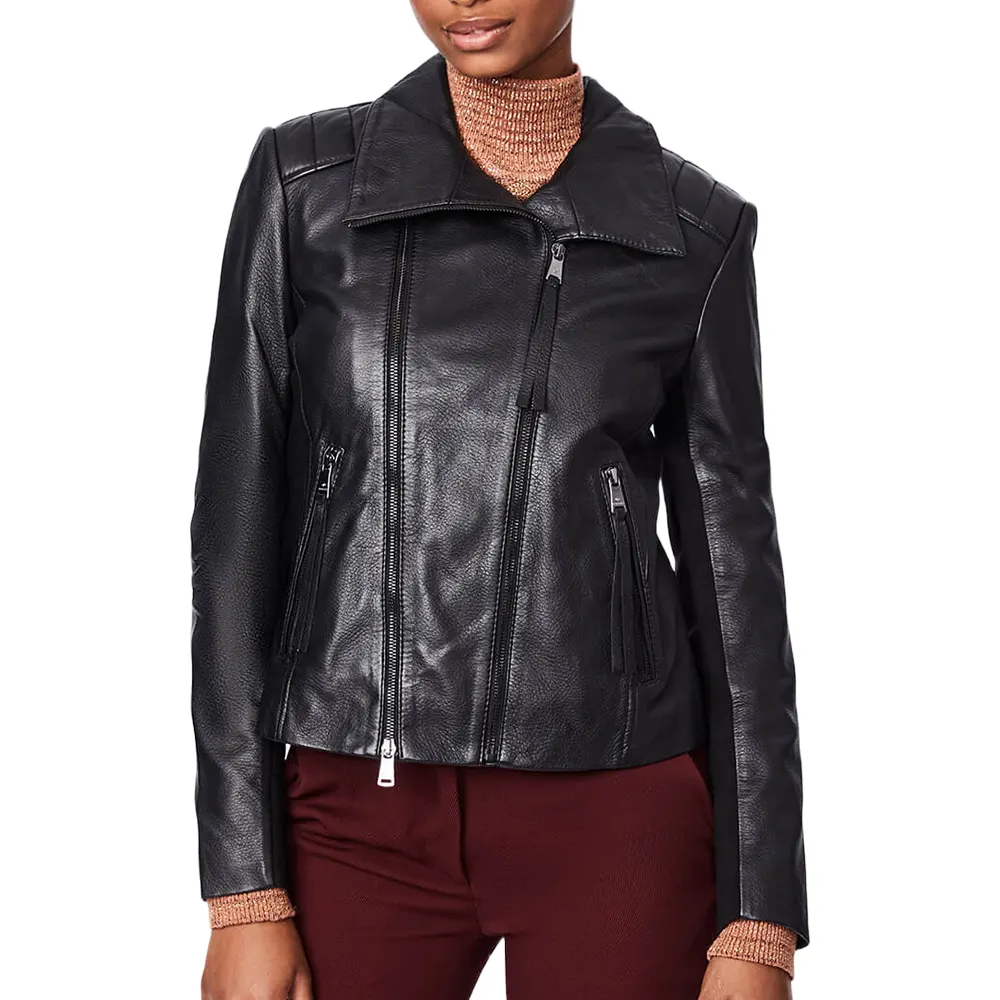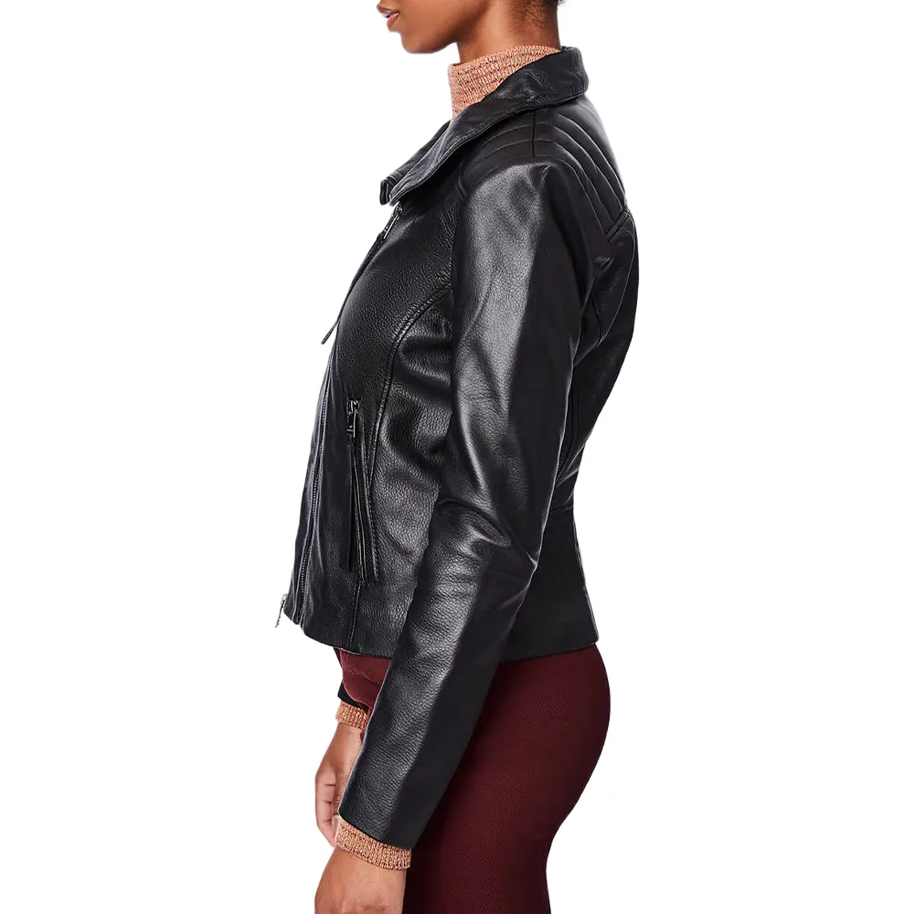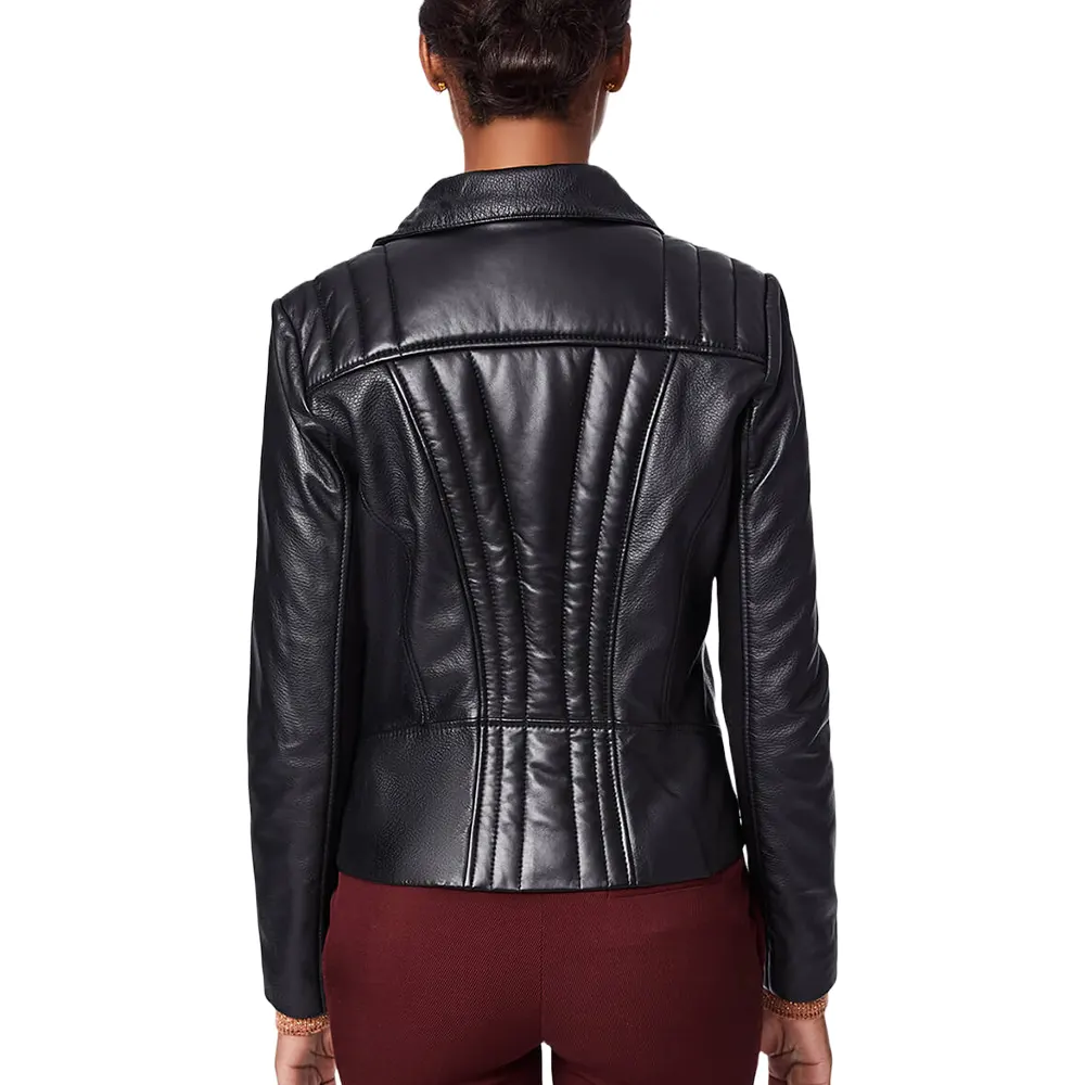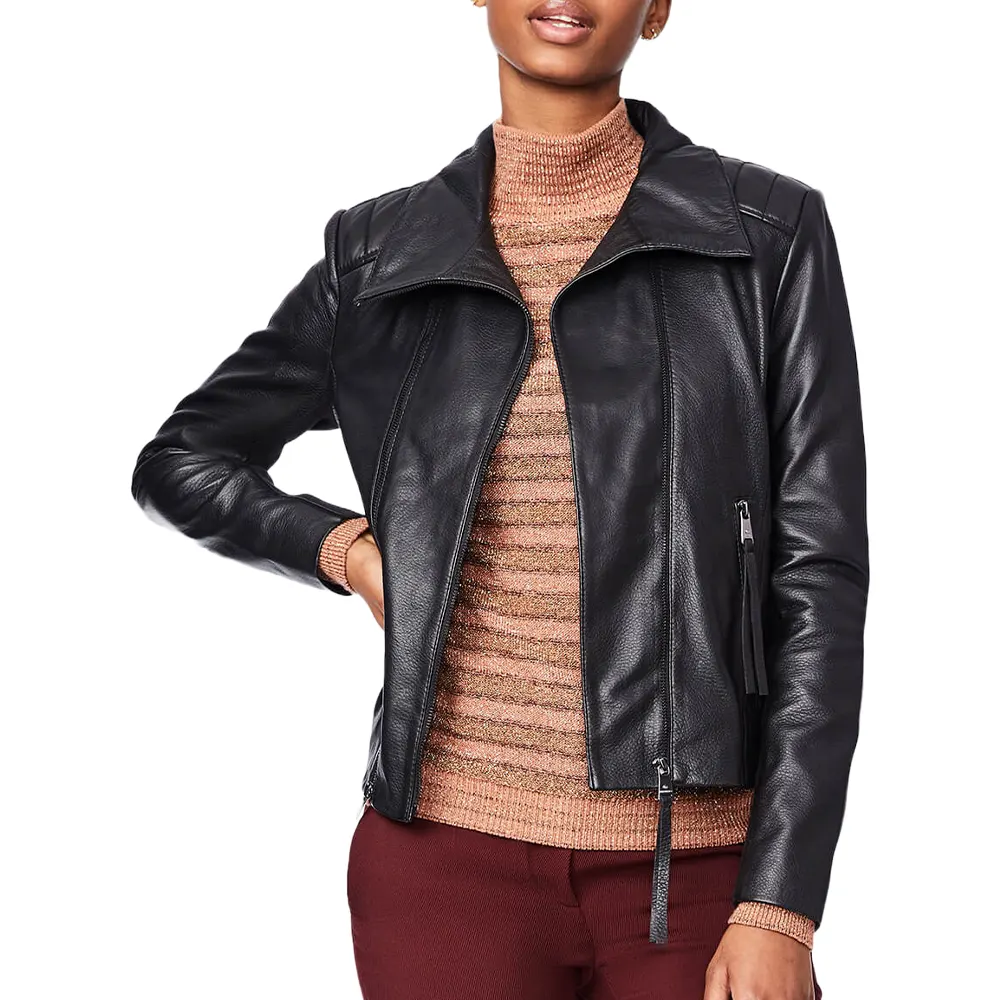 Women’s Long Collar Black Faux Leather Biker Jacket