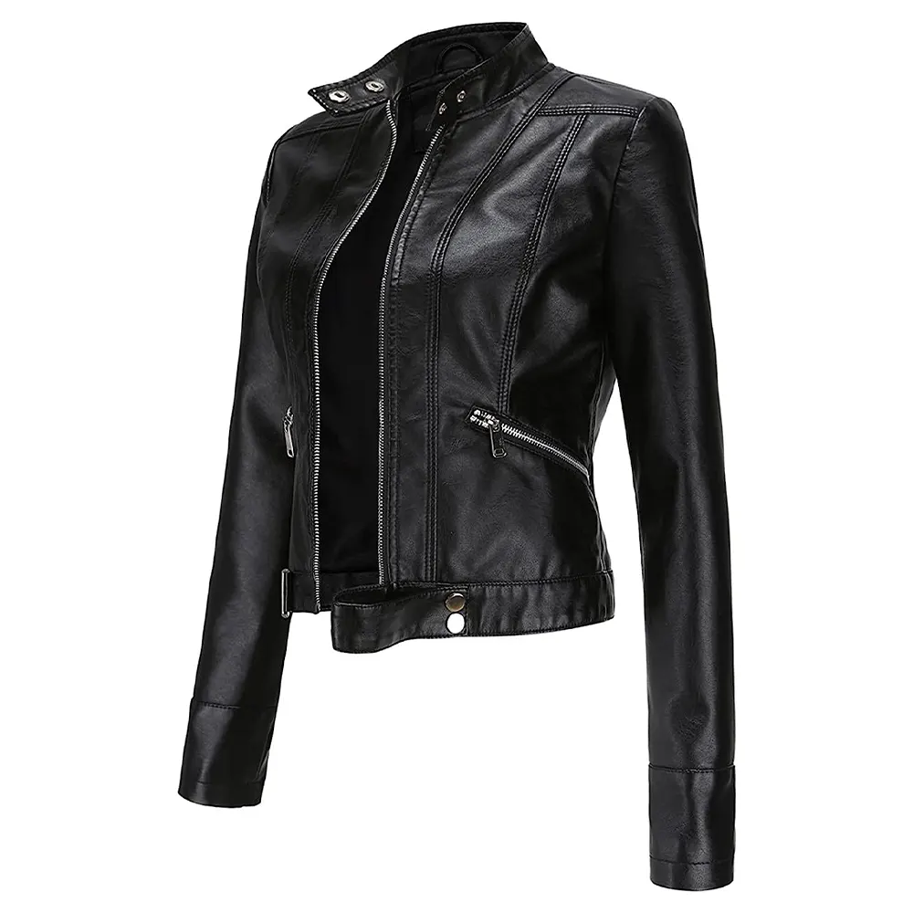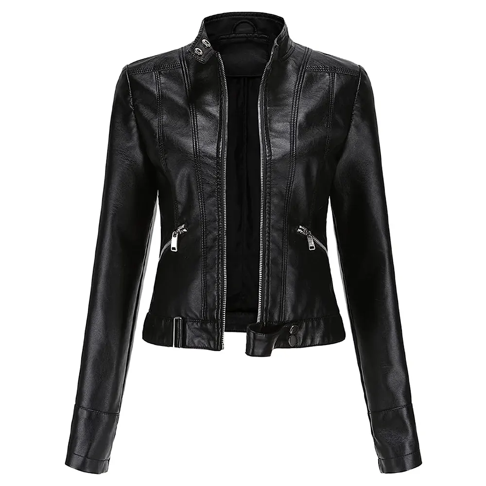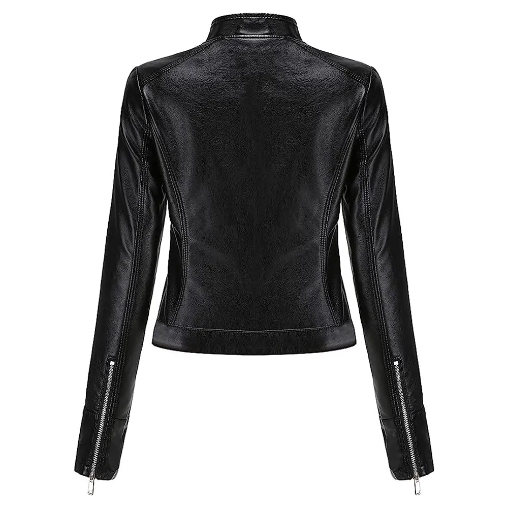 Women’s Stand Collar Black Faux Leather Short Jacket